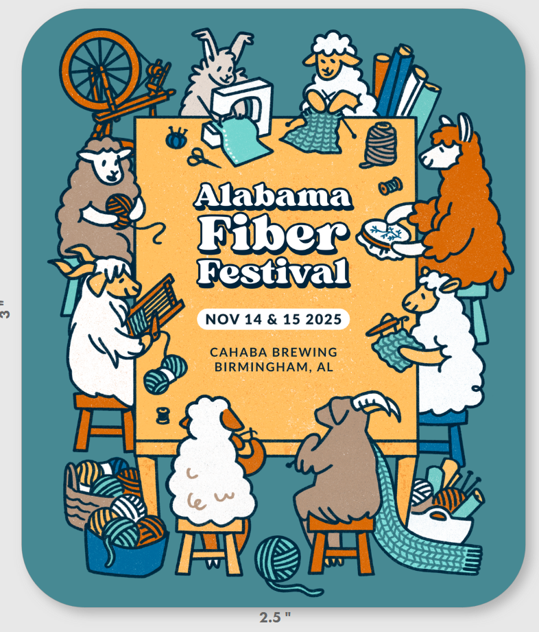 This item is part of a limited-time pre-order for the Alabama Fiber Festival. The image shown is a mockup—actual sticker colors and sizes may vary slightly. If we don’t receive the minimum number of pre-orders, we’ll issue a full refund for this item.